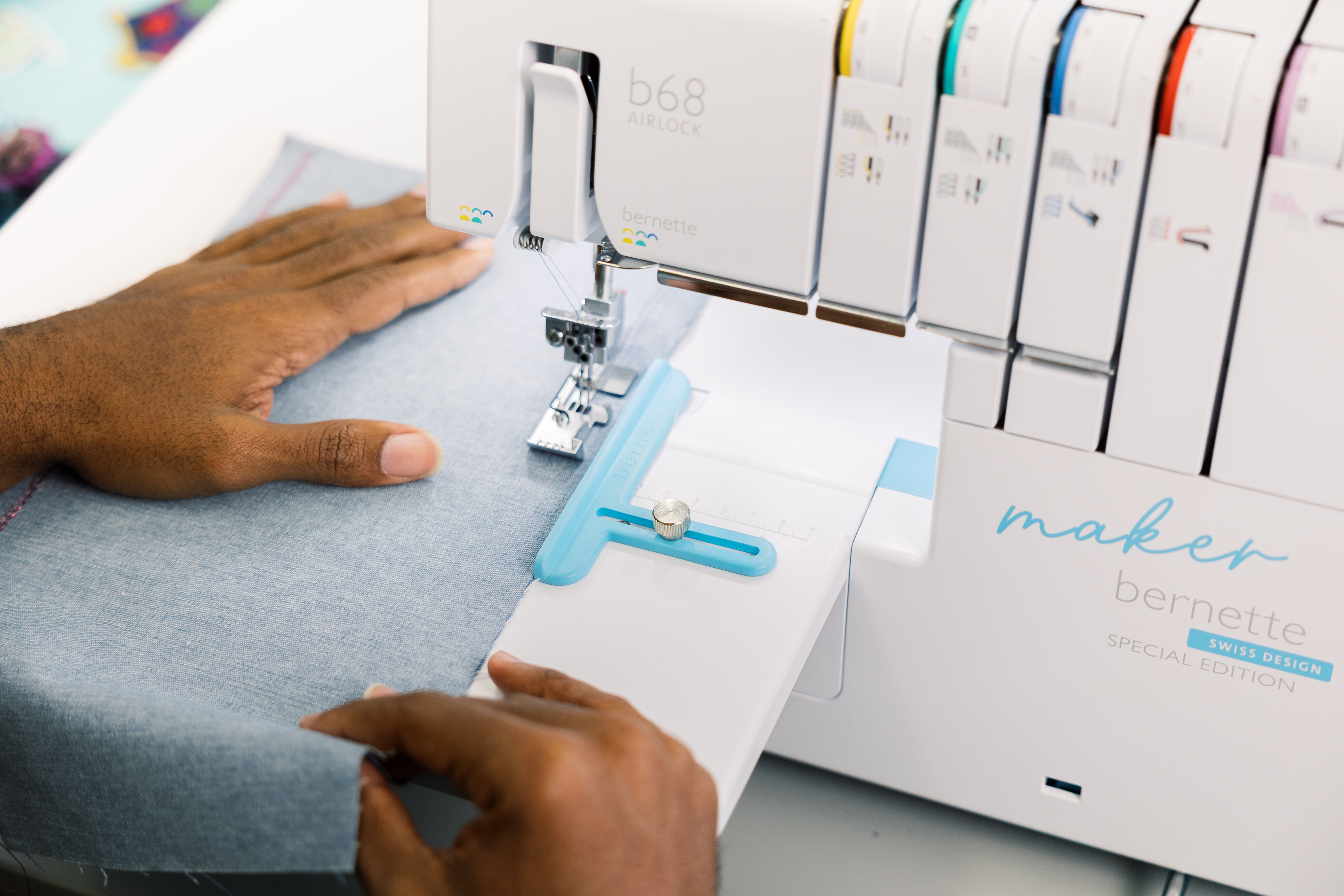 Le guide-tissu maintient le tissu bien aligné pour obtenir des ourlets droits et réguliers sans effort. Il se règle jusqu’à 40 mm à droite de l’aiguille pour une parfaite gestion de la couture.
